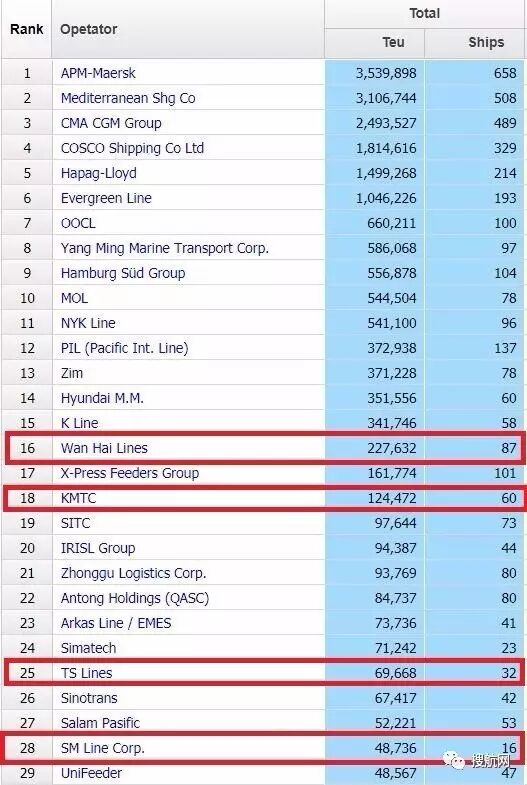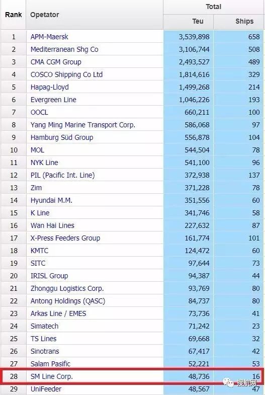 今年3月开始正式运营的SM LINE目前已经拥有集装箱船只16艘,总运力达到48736Teu,在Alphaliner全球运力排行榜上排名28。